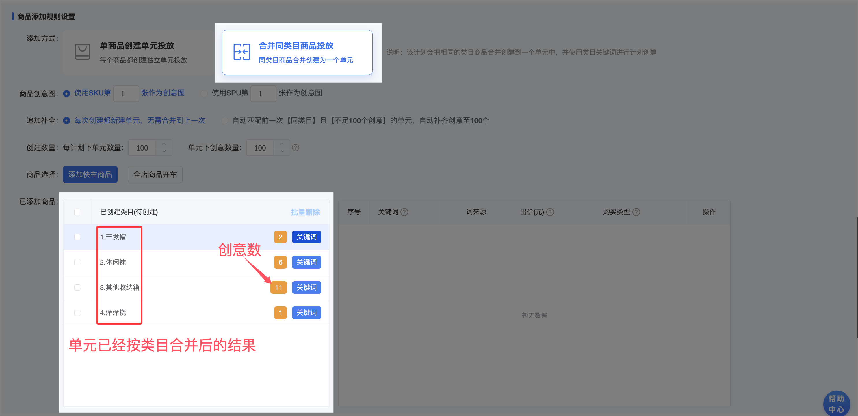 如果店铺需要投放的商品很多,或者是物料额度不够用的情况,建议可以把同类目的商品合并到一个单元投放,这样一个单元最多可以绑定100个商品(每个商品取1个SKU),全店开车的时候,可以更好的利用物料额度的规则,去放大商品的曝光概率。