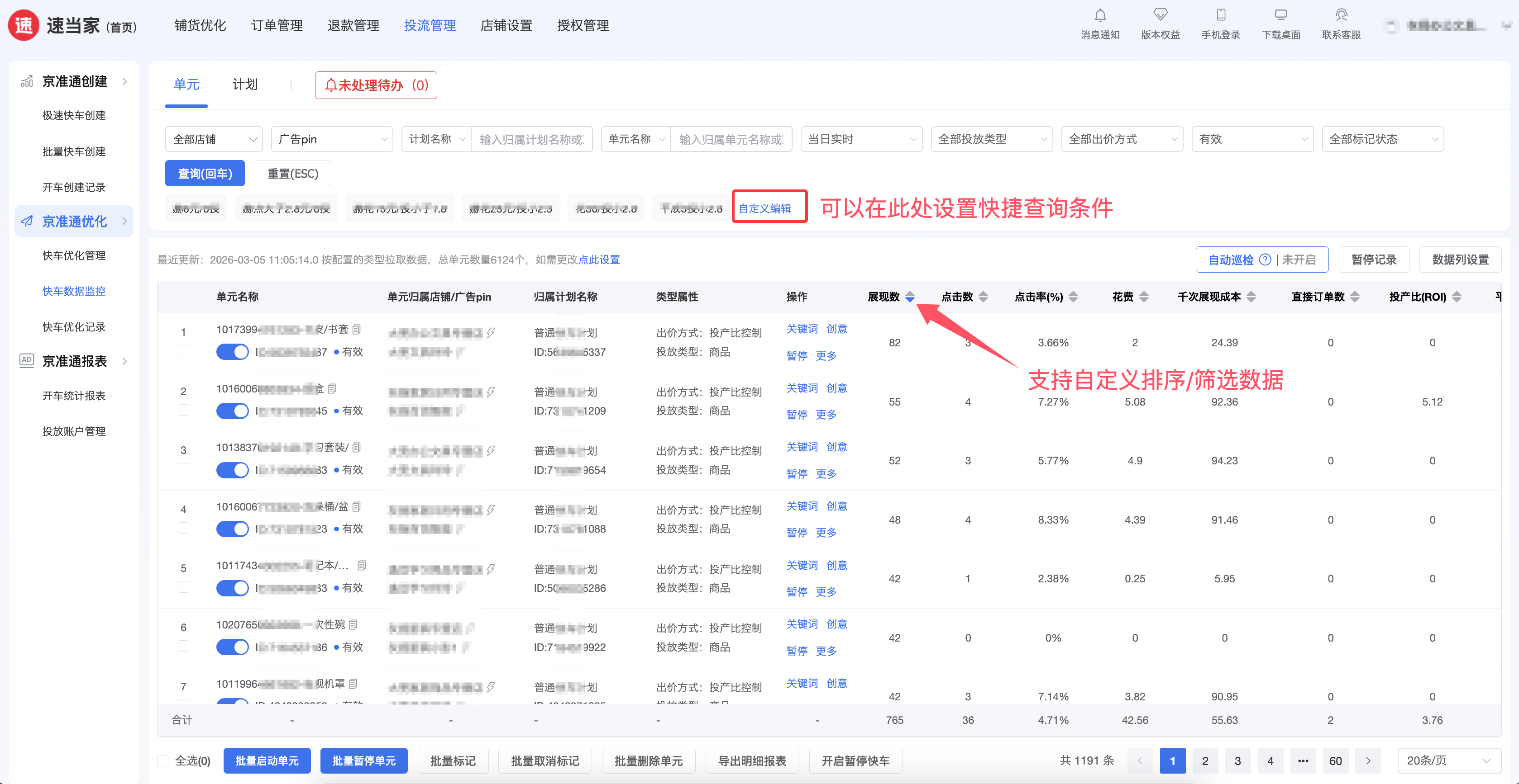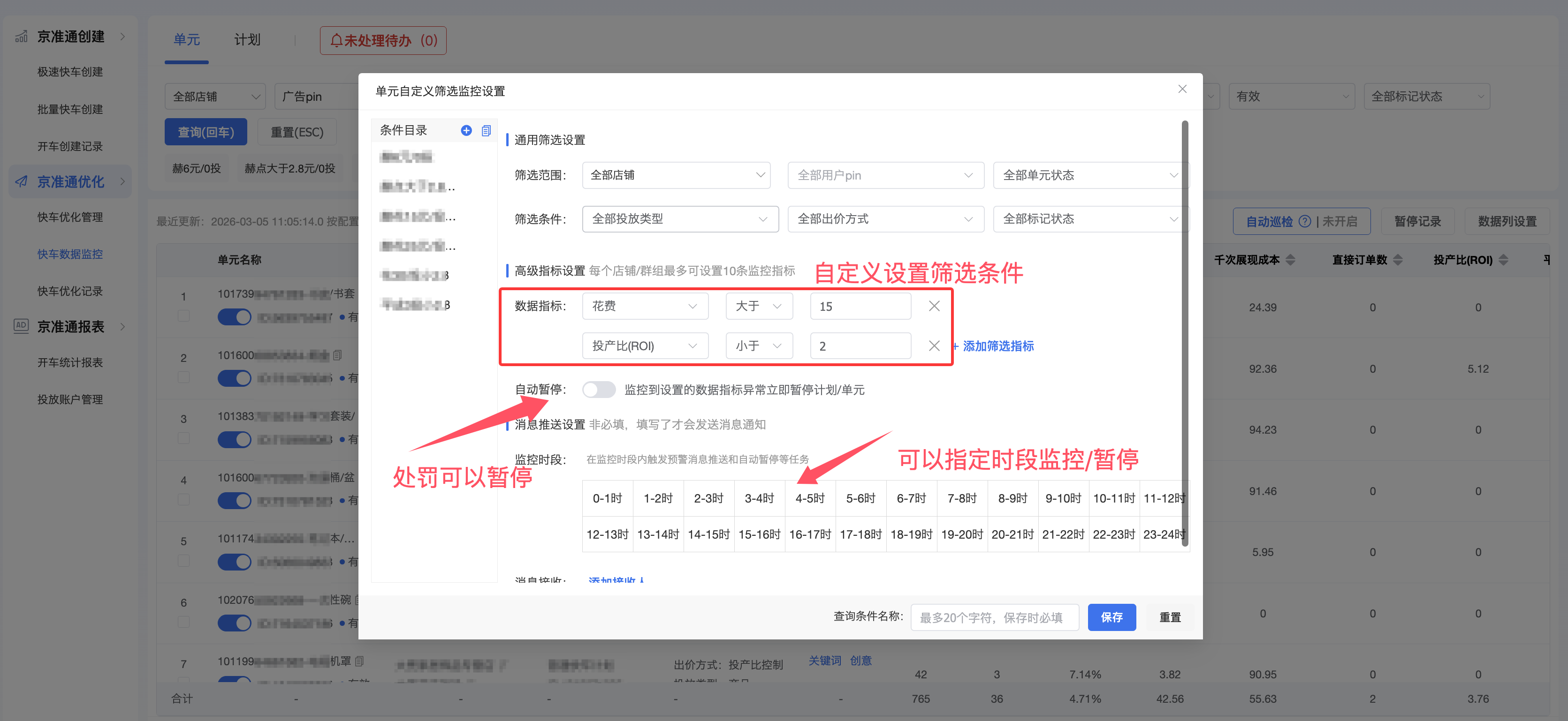 速当家支持自定义设置一些监控条件,例如重点监控花费超过15元且ROI=0的单元,去关停,就可以在自定义筛选条件中设置好对应条件,每次同步数据后,可以快捷的筛选出这些计划/单元批量暂停即可。