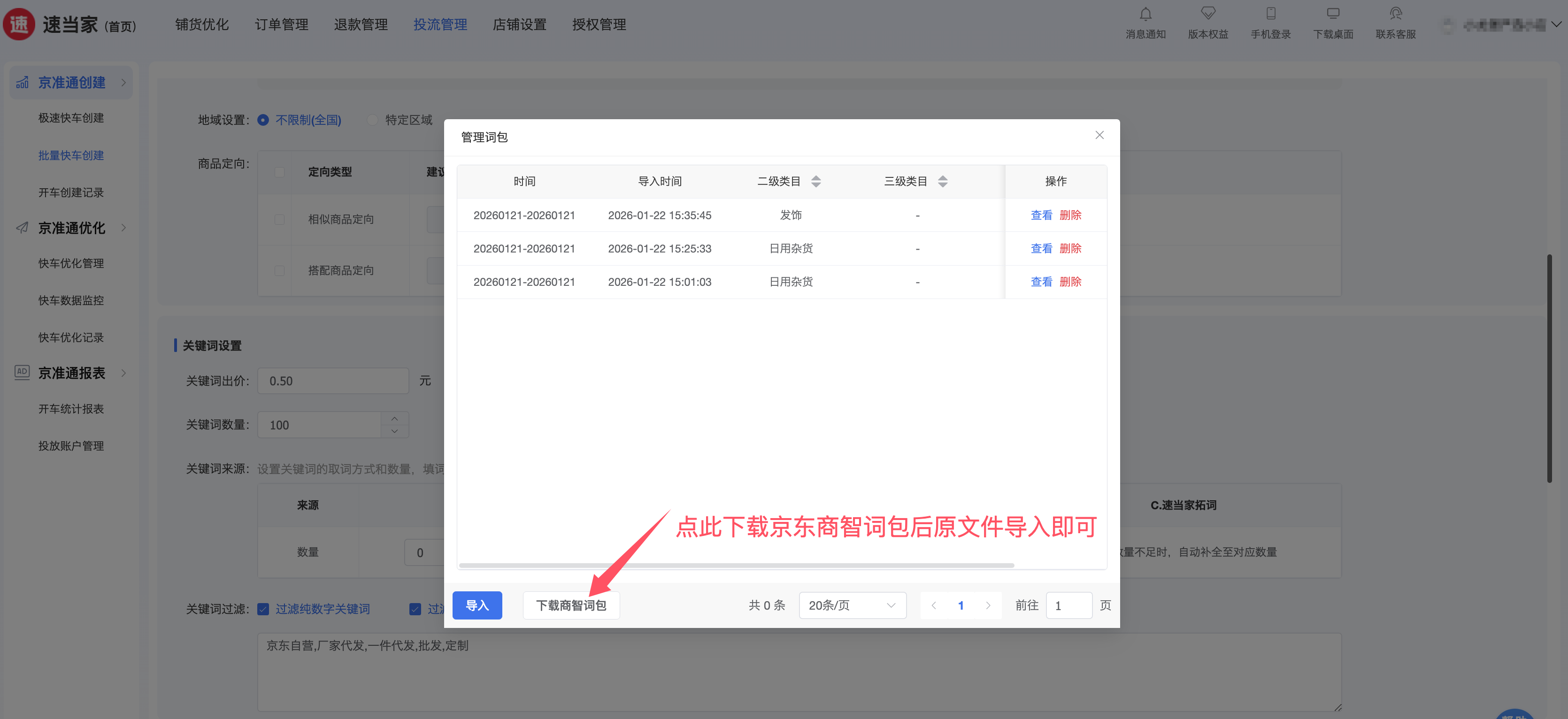 在京东商智中心,每个店铺根据规则订购后都可以查看,这是平台根据当前店铺的经营类目呈现的热搜、交易、潜力的关键词,这一份关键词榜单可以导入速当家,在创建快车时可以按固定比例取出商智词包的关键词用于快车推广。