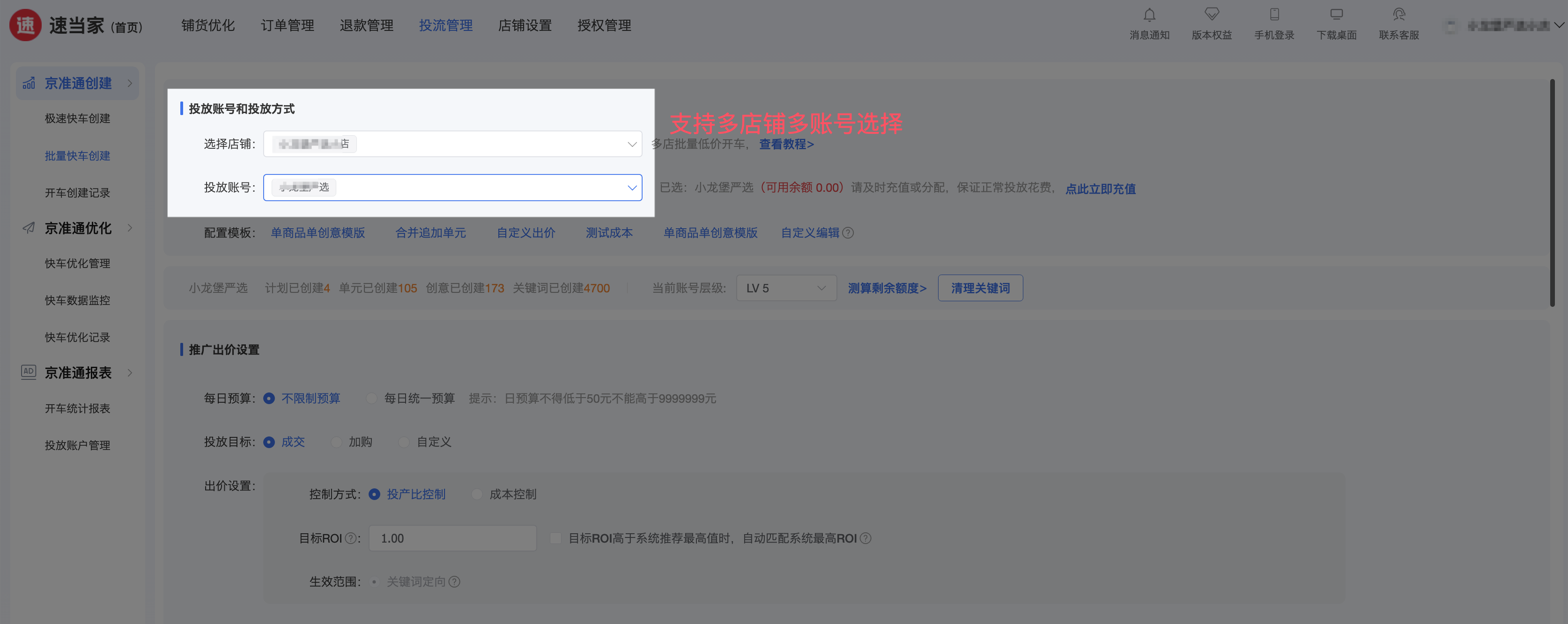 在速当家批量创建快车页面(页面链接),支持单次选择多个投放账号(pin)去创建投放计划,也支持单次选择多店铺多个投放账号(pin)批量创建,相较于京准通后台,单店单pin操作,每次只能创建1个计划,最多100个商品,速当家支持批量全店商品开车,无需切换登录账户,对于多店铺卖家来说,真正实现一个账号全店开车。