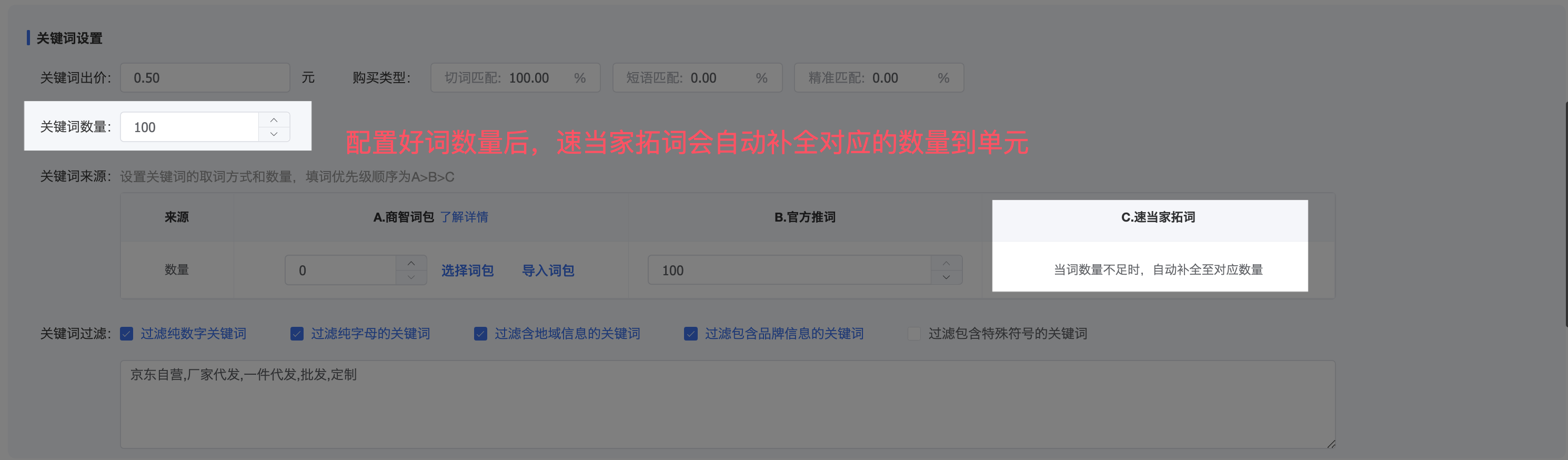 总结:速当家的梯度取词工具,支持商家根据推广需求灵活配比应用,例如每单元100个关键词的分配规则下,可以取50个官方推词+50个速当家推词,即保证有相对的曝光量,又可以通过长尾词覆盖的方式降低整体花费