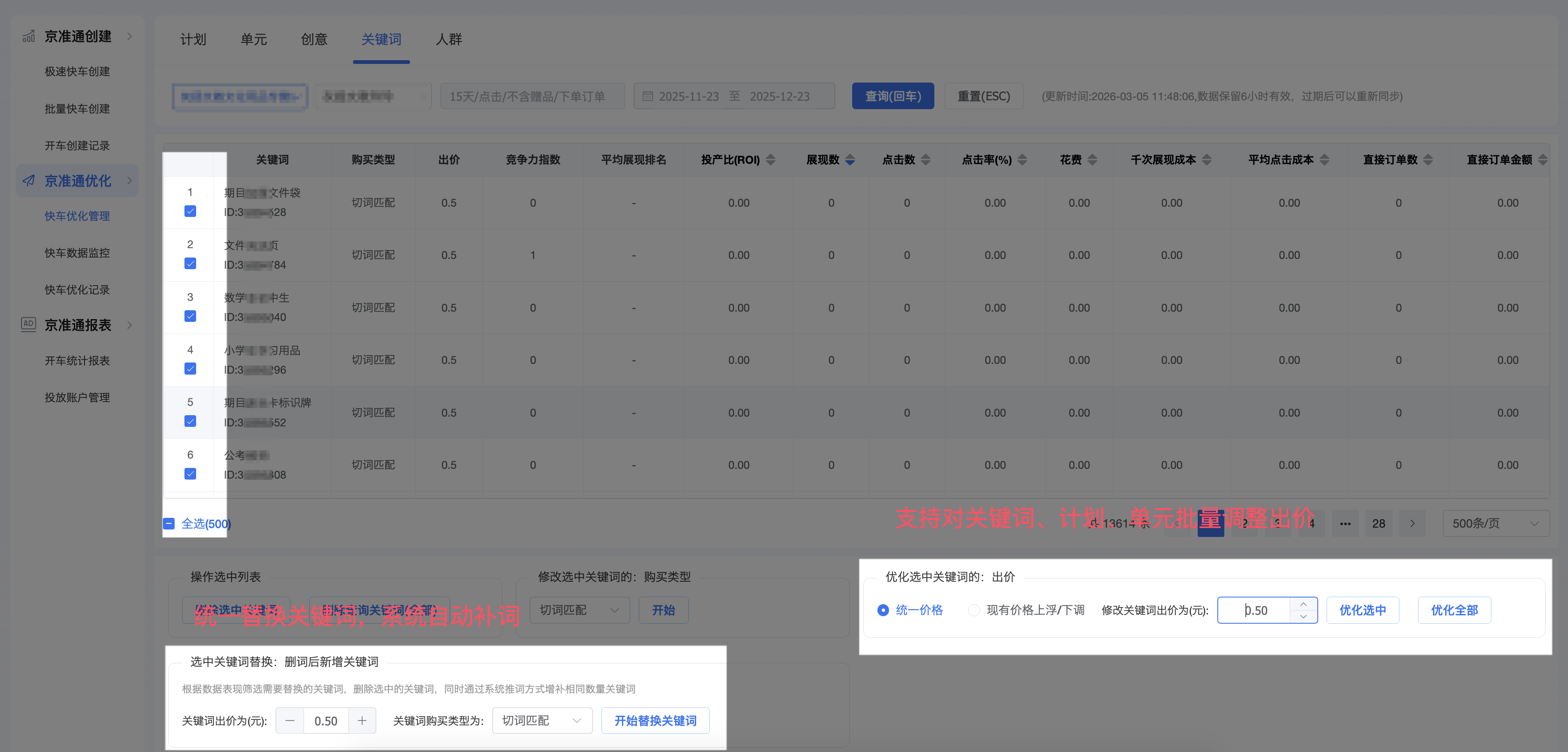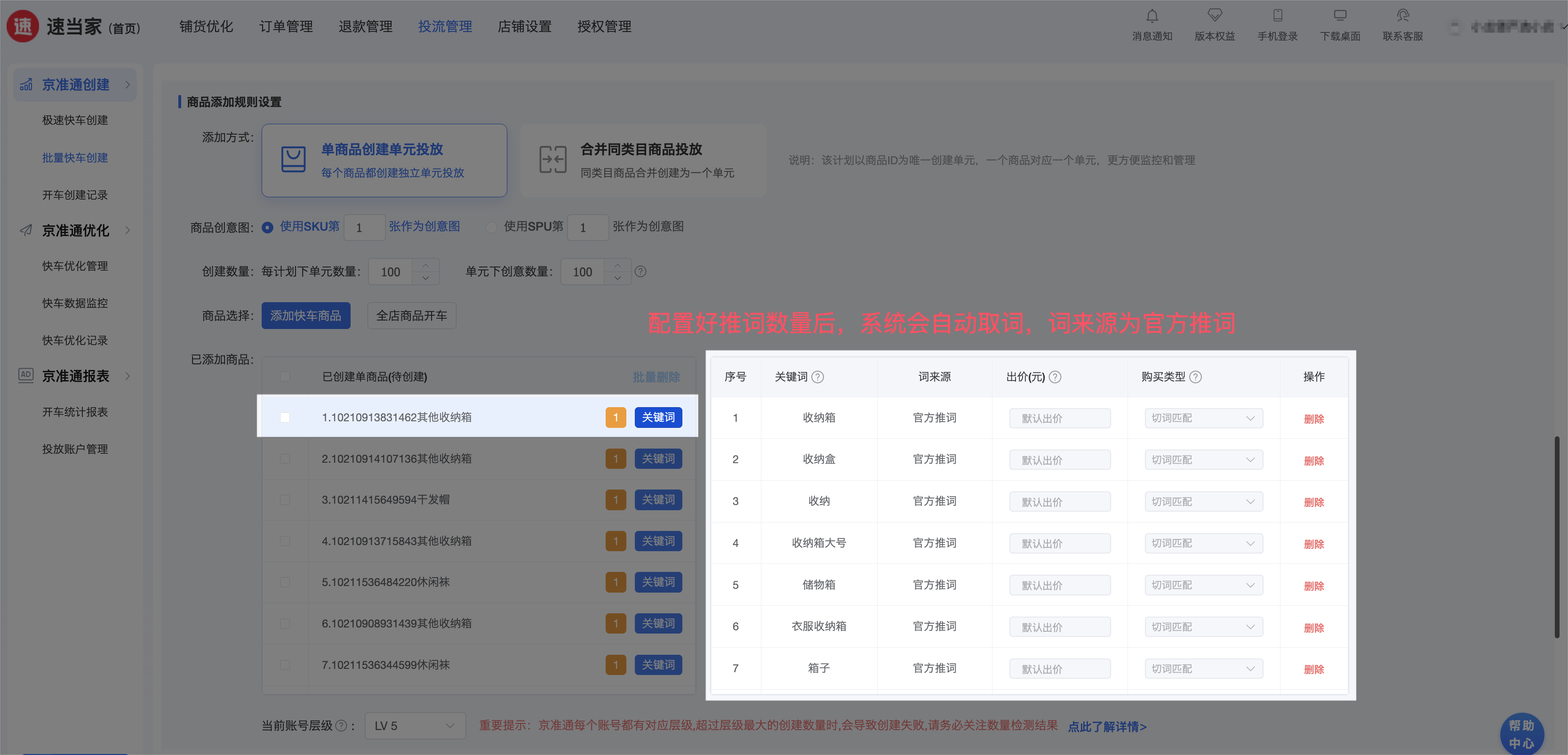 是通过京准通的推词能力,快速匹配投放商品信息,生成对应关键词,这部分关键词,是平台根据商品属性并结合平台搜索热度(曝光量)推荐出来的,可以完全匹配到每一个商品,可用度比较高,缺点是有部分热搜词可能导致花费偏高。新手卖家或者多店铺卖家建议使用