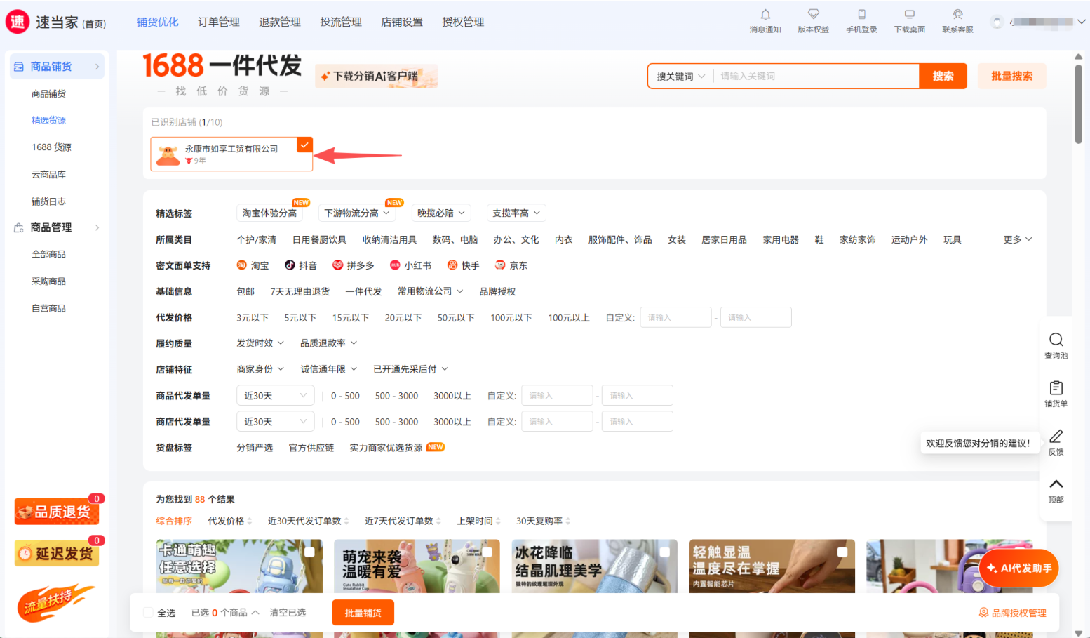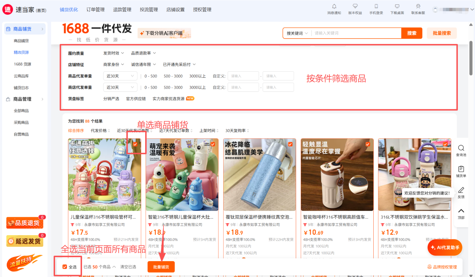 可根据条件筛选后 再选品铺货,或 直接选品 点击 【批量铺货】到店铺;