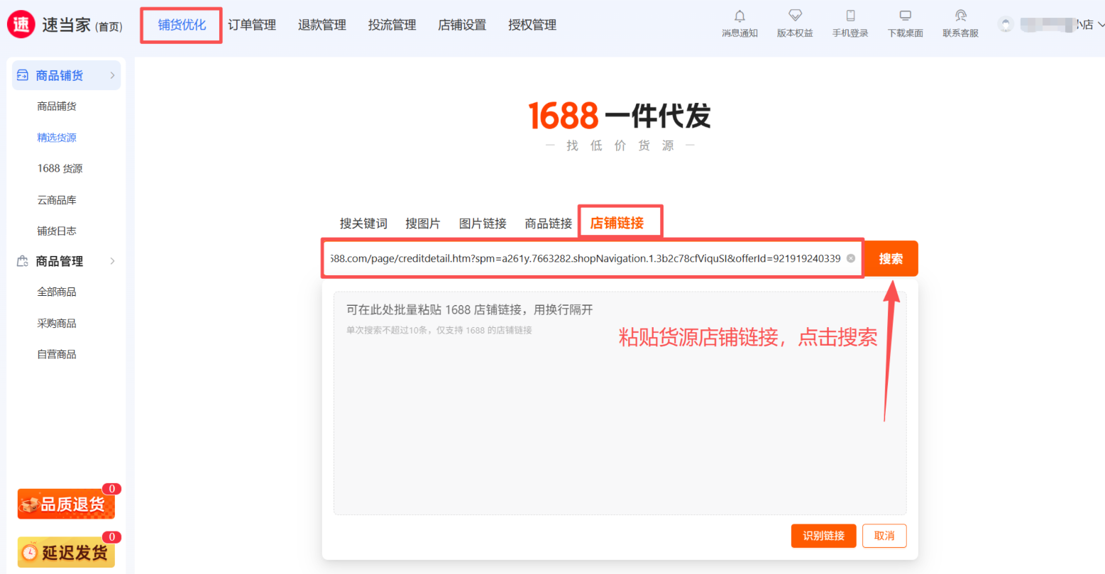 进入速当家【铺货优化-1688货源-店铺链接-粘贴货源店铺链接】 点击【搜索】