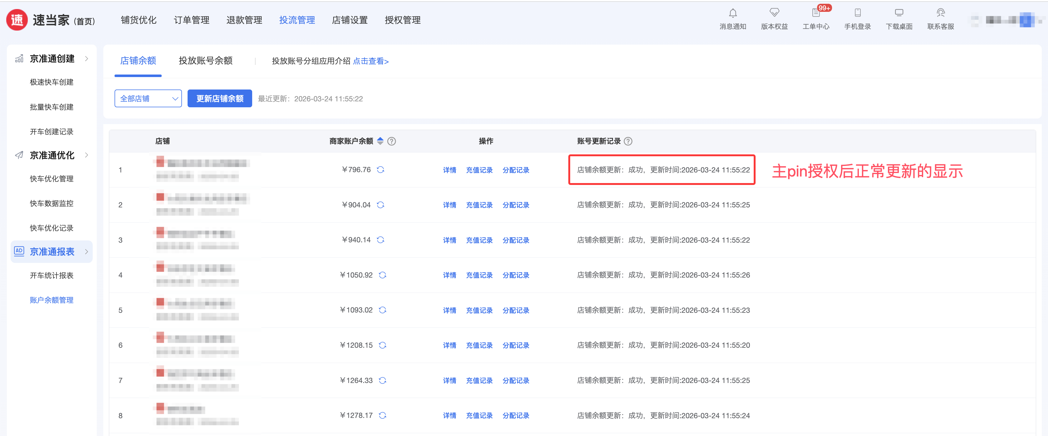 3.登录速当家后,在【投流管理】>【投放账号余额】>【店铺余额】菜单重新更新店铺余额即可。