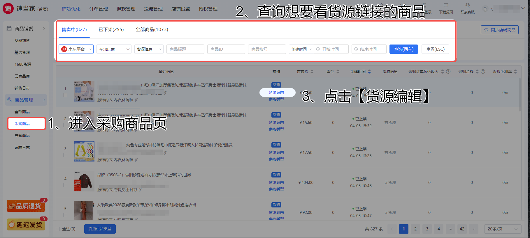 一、进入铺货优化-商品管理-采购商品页,搜索你想查看货源链接的商品,点击【货源编辑】,就看到货源链接了