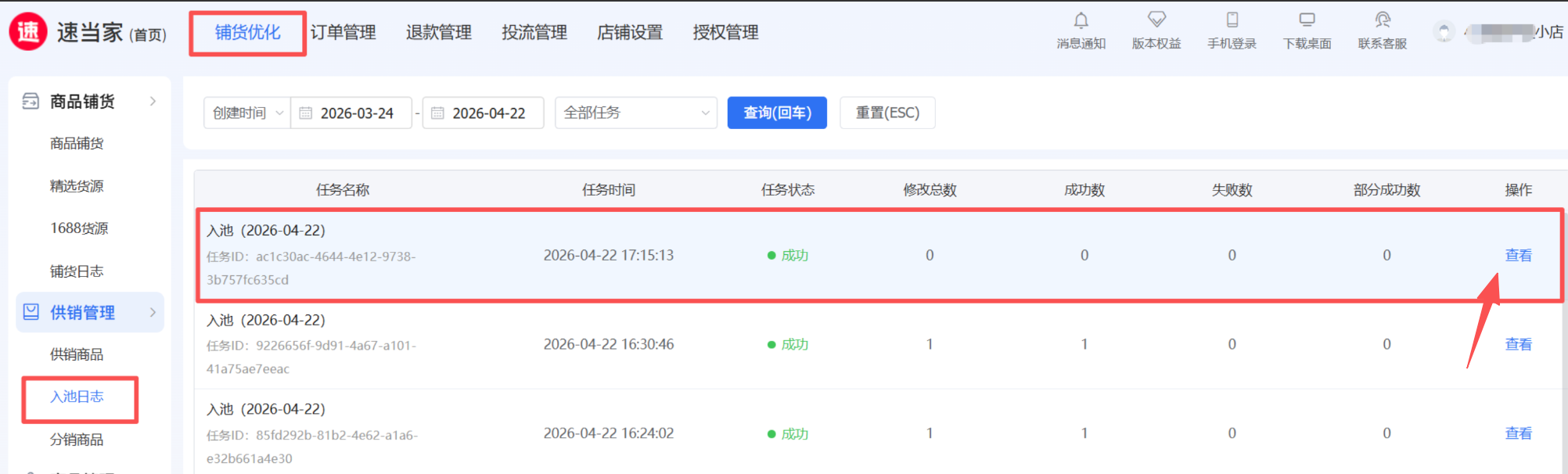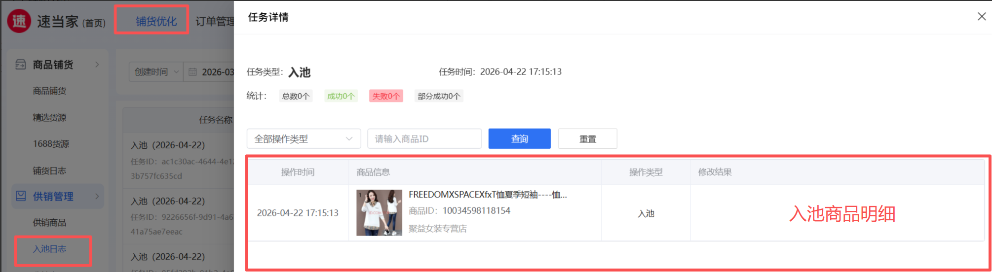 商品铺货成功并审核通过后入池,可在【入池日志】查看结果,点击【查看】入池商品明细;