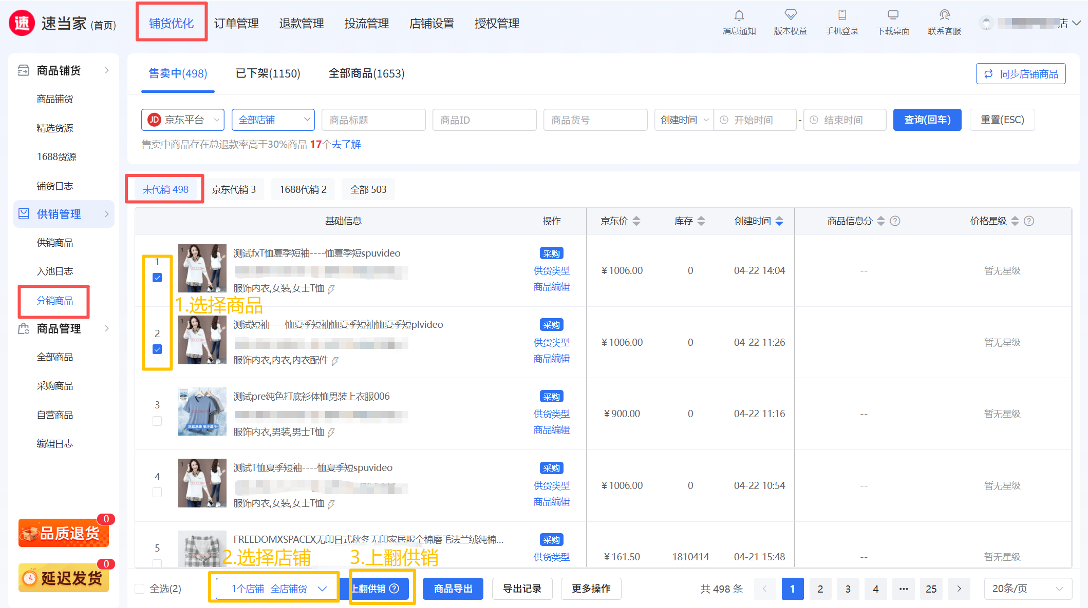 选择需要上翻商品的【代销店】,前往铺货优化 ->供销管理 ->分销商品 页面;