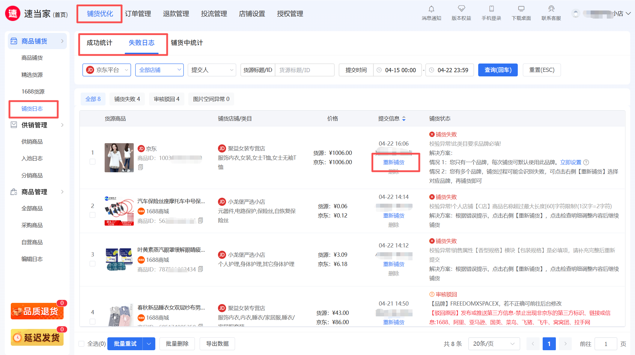 选择商品上翻后,可在铺货日志查看结果,针对铺货失败的品,可根据失败原因点击【重新铺货】修改重新提交;