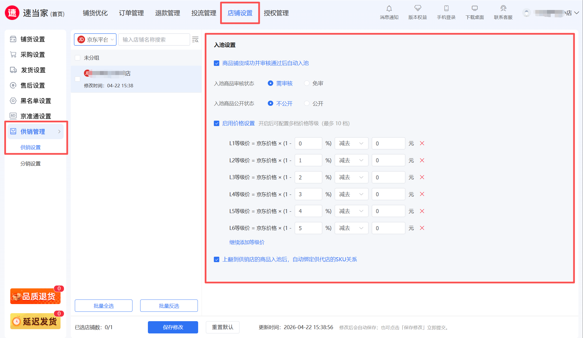 Tips: 配置后,上翻到供销店商品审核入池后,【代销店】与【供销店】自动实现代销商品的SKU绑定,产生订单后可直接一键采购下单;