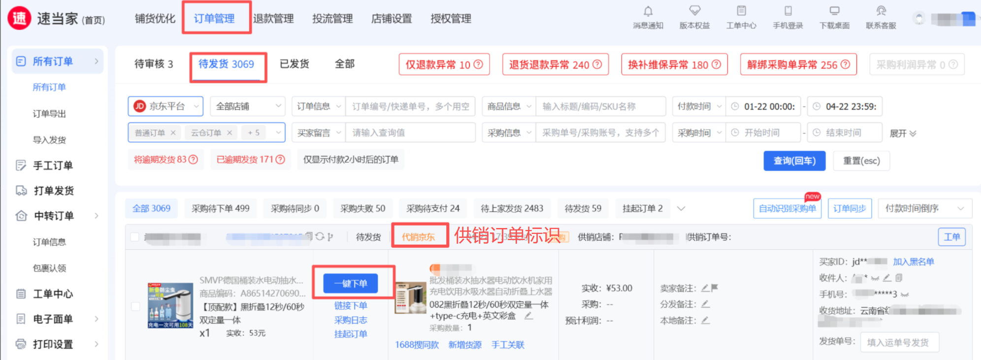 前往 订单管理 ->待发货订单页面, 选择需要采购的订单 点击【一键下单】支付完成采购即可;