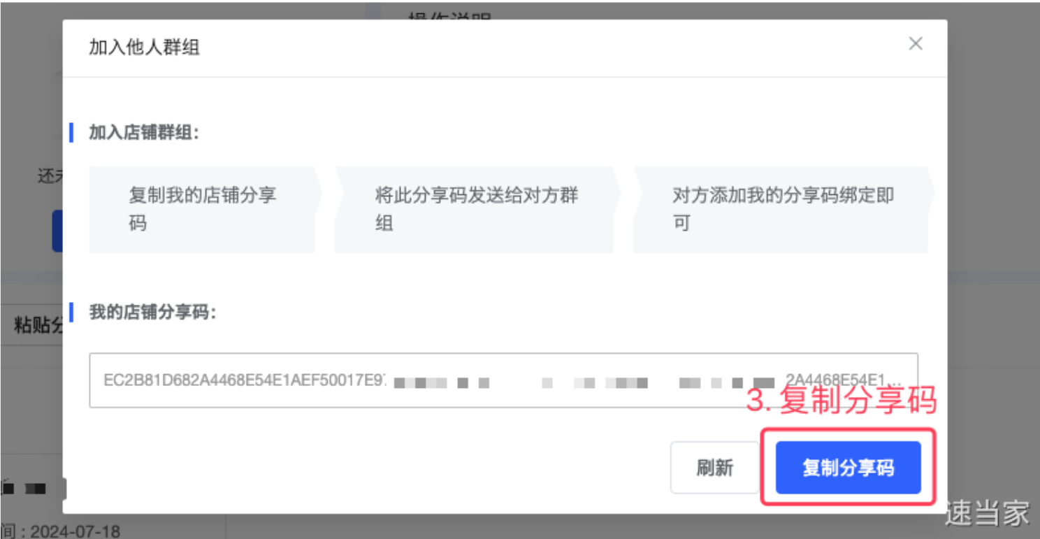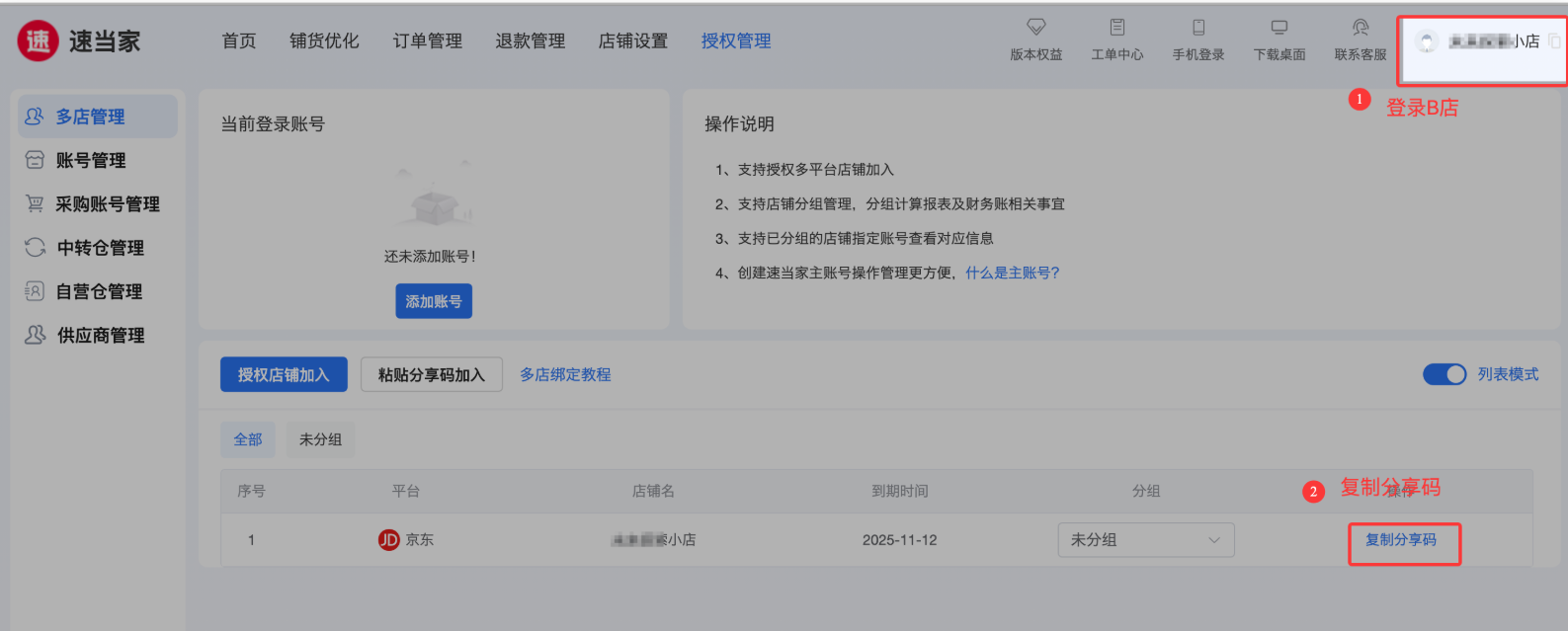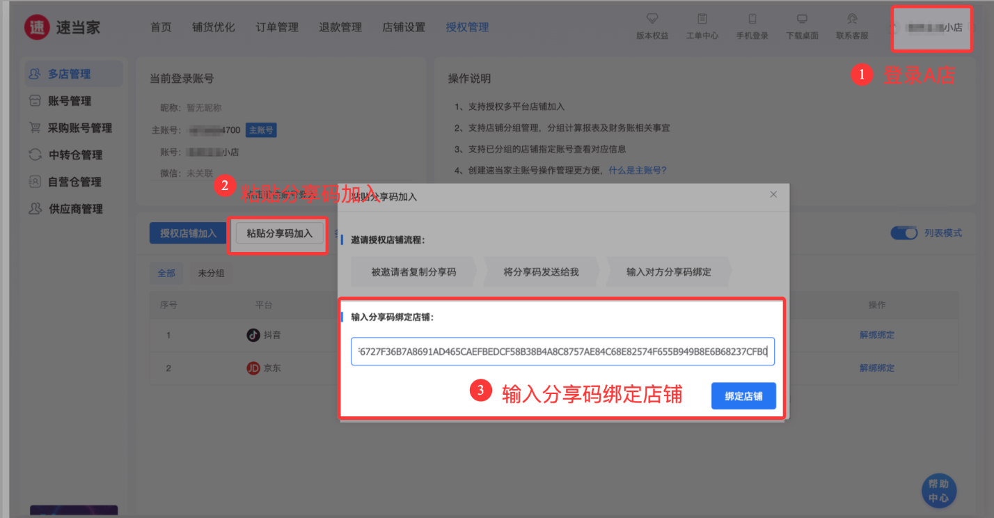 登录B店铺,复制B店铺分享码,到A主店 粘贴分享码进行绑定;
