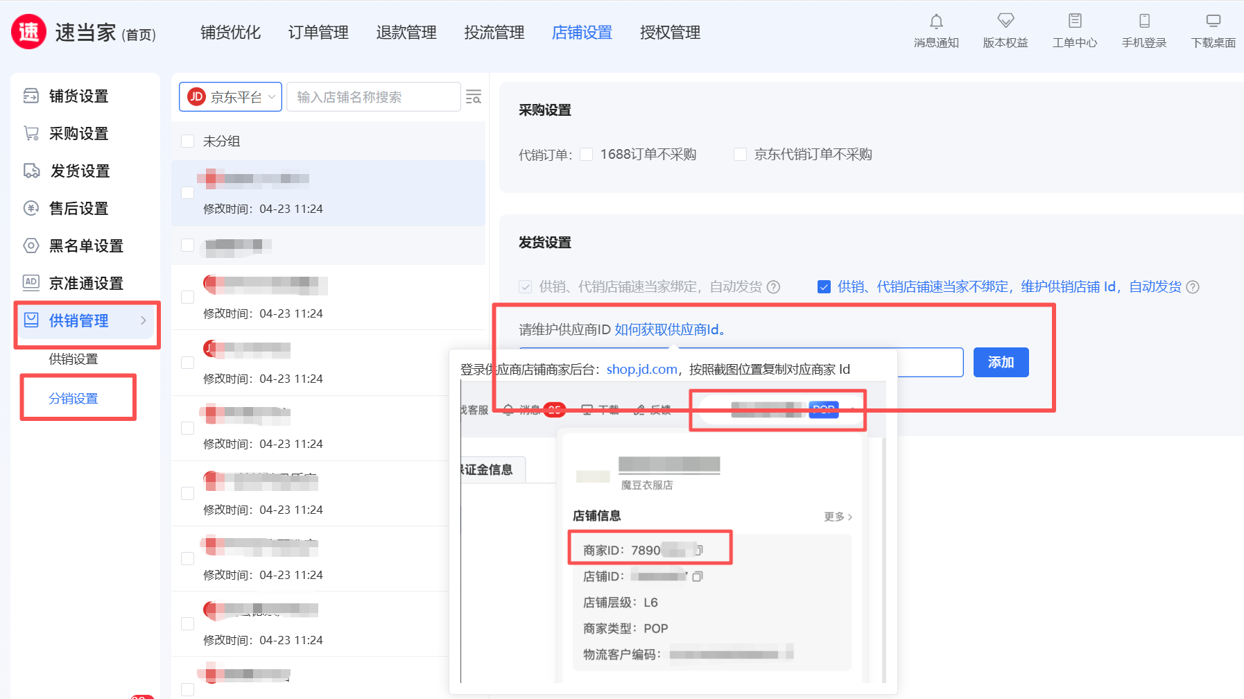 前往京麦商家后台右上角获取商家ID,到速当家【分销设置】添加进行关联授权;