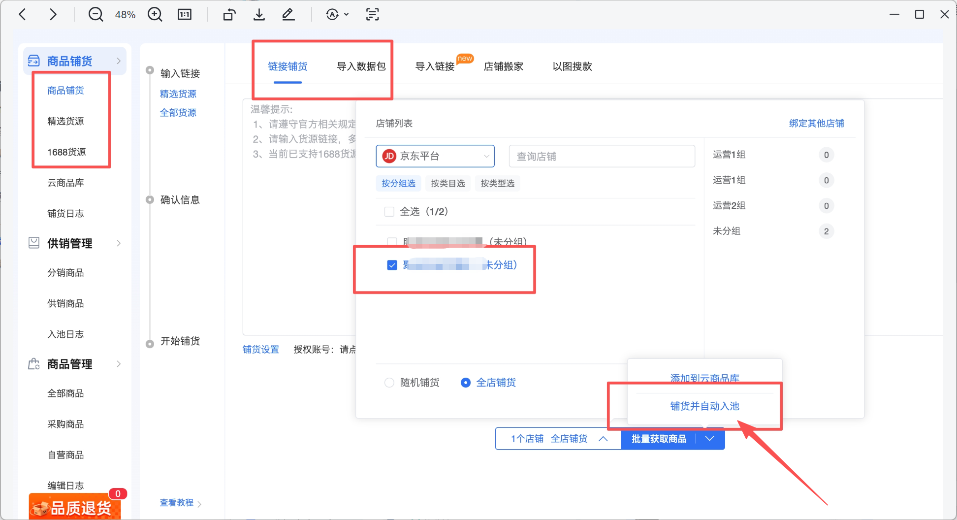 - ① 新品入池,发布新商品时,审核通过可直接铺货并入池;